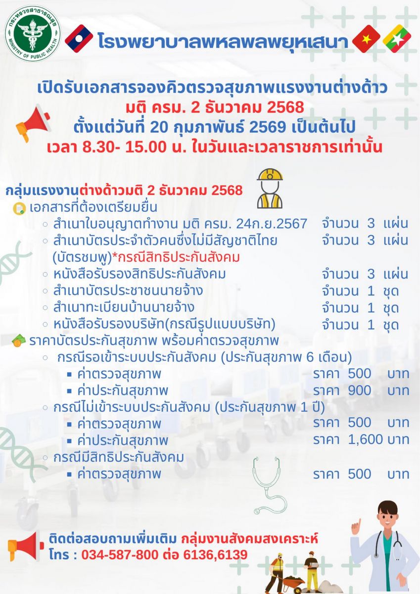 รพ.พหลฯประกาศจองคิวตรวจสุขภาพ กลุ่มแรงงานต่างด้าว ตามมติ ครม.2 ธ.ค.68 เริ่มวันนี้ สิ้นสุด 31 มี.ค.