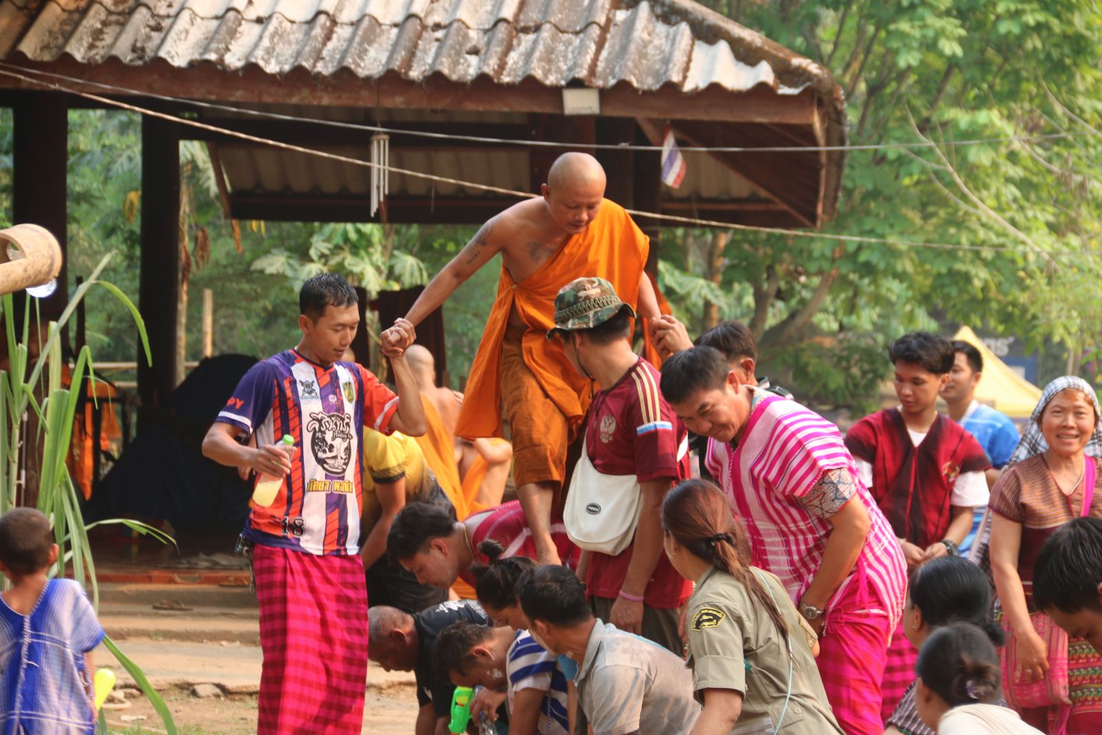 ประเพณีสงกรานต์ของชาวบ้านสะเนพ่อง นั้นไม่ได้เน้นความสนุกสนาน แต่เน้นพิธีกรรมที่สืบทอดต่อกันมาอย่างยาวนาน โดยกิจกรรมช่วงเช้าของวันนี้ เริ่มต้นด้วยพิธีตักบาตรใต้ต้นโพธิ์ ที่อยู่ด้านหลังวัดสะเนพ่อง ชาวบ้านและผู้มาร่วมงานทั้งหมดจะมารวมกันที่ใต้ต้นโพธิ์ใหญ่ ที่แผ่กิ่งก้านให้ความร่มเย็น