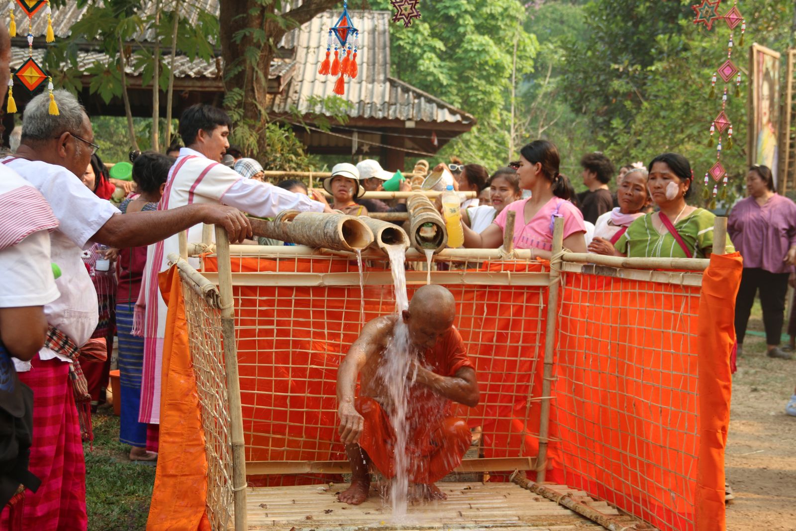 ส่วนพิธีการสุดท้าย คือ การสรงน้ำพระสงฆ์ โดยจะมีการนำไม้ไผ่ผ่าซีก มาวางต่อกันเป็นท่อยาวไปยังซุ้มอาบน้ำที่สร้างขึ้นมา โดยผู้ที่จะมาสรงน้ำพระจะเตรียมน้ำหอมน้ำปรุง มายืนรอข้างๆ รางไม้ไผ่ที่เตรียมไว้