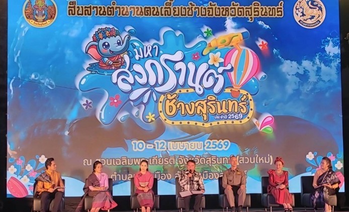 สุรินทร์ -ที่บริเวณสวนสาธารณะเฉลิมพระเกียรติพระบาทสมเด็จพระเจ้าอยู่หัวเฉลิมพระชนมพรรษา 80 พรรษา (สวนใหม่) ตำบลนอกเมือง อำเภอเมืองสุรินทร์ จังหวัดสุรินทร์ นายจำเริญ แหวนเพชร ผู้ว่าราชการจังหวัดสุรินทร์ พร้อมส่วนที่เกี่ยวข้อง ร่วมกันแถลงความพร้อมและเชิญชวนักท่องเที่ยวได้มาสัมผัสและร่วมงานสืบสานพระราชเสาวนีย์ วิถีช้างคืนถิ่น มหาสงกรานต์ช้างสุรินทร์ 2569 เนื่องในงานวันช้างไทยและงานแสดง แสง สี เสียง สืบสานตำนานคนเลี้ยงช้าง” ระหว่างวันที่ 10-12 เมษายน 2569 ปีนี้จัดยิ่งใหญ่