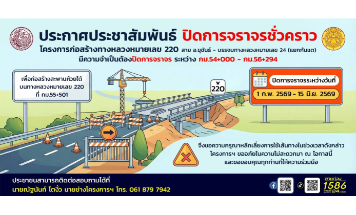 ผอ.แขวงทางหลวงศรีสะเกษที่ 1 แจ้งเตรียมปิดการจราจร ถนนสาย ขุข